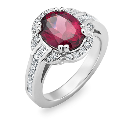 10X8 MM oval rhodolite garnet center surrounded with round pave diamonds and princess channel set diamonds down the shank