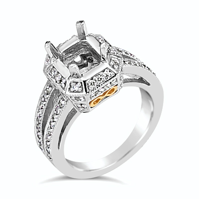 6.00 MM radiant center engagement ring with round diamonds set on top and side of halo also diamonds set on a split shank