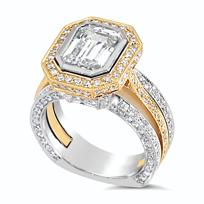 9X7 MM emerald cut bezel set center engagement ring with pave set diamonds on top and sides of halo also pave set diamonds on top and sides of triple Euro shank