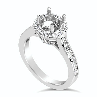 6.50 MM round center engagement ring with pave set diamonds around halo and channel set round diamonds down the shank also peek-a-boo princess diamond under halo