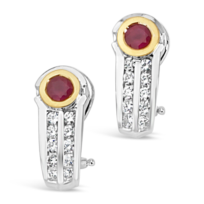 Two tone round bezel set ruby and channel set round diamonds with omega back earring>